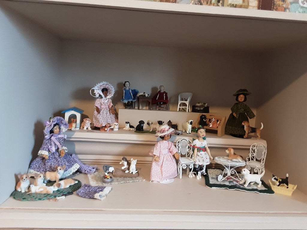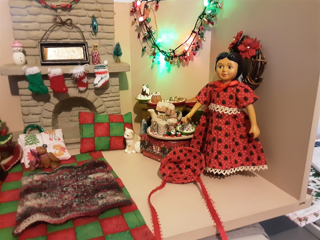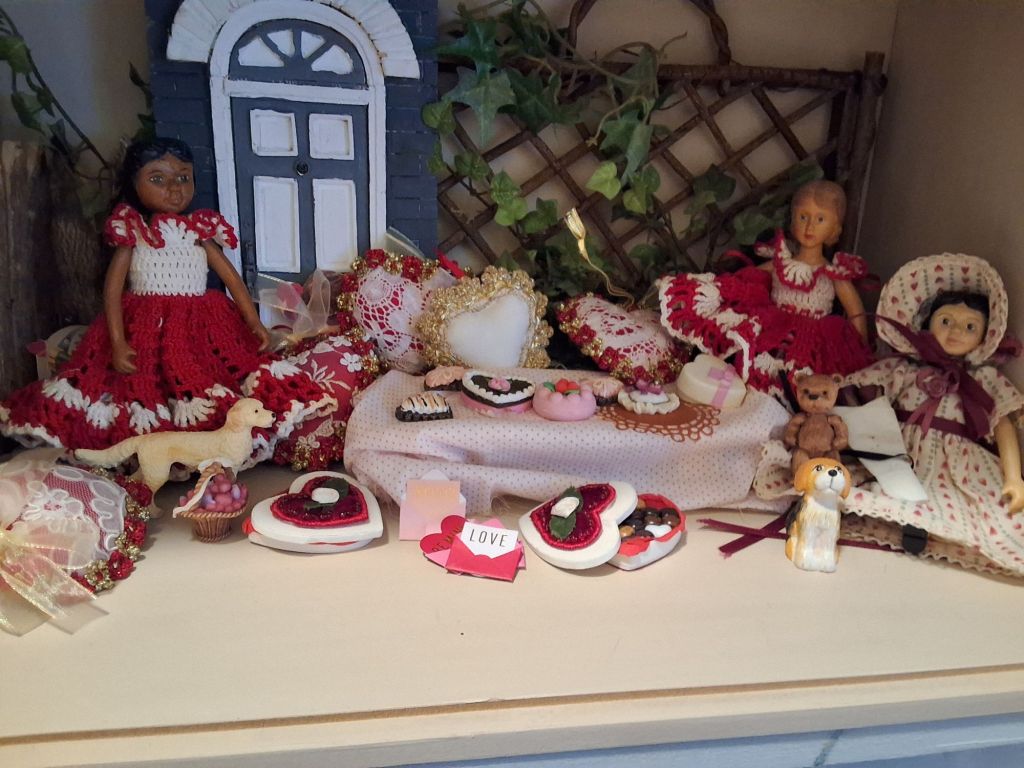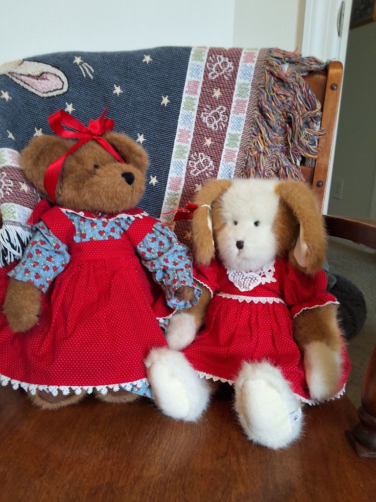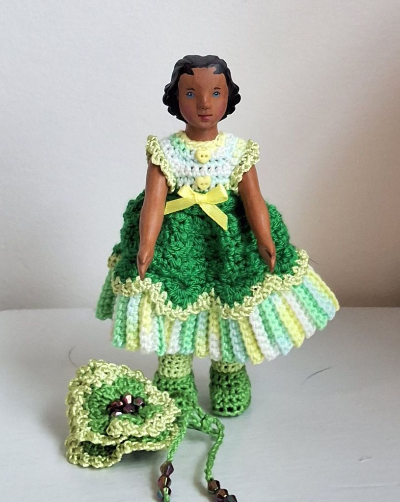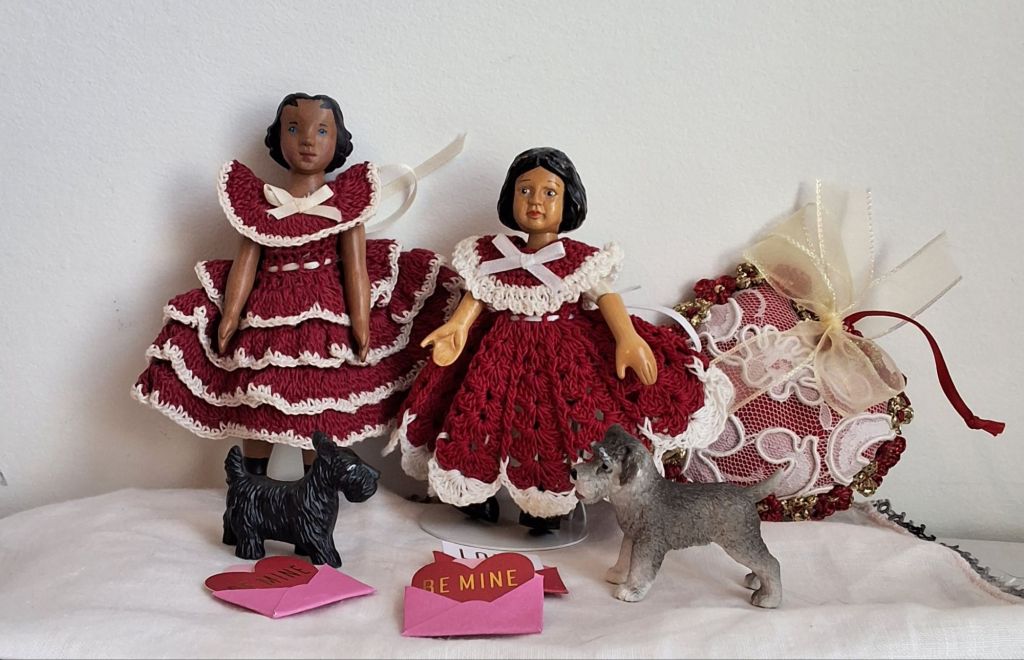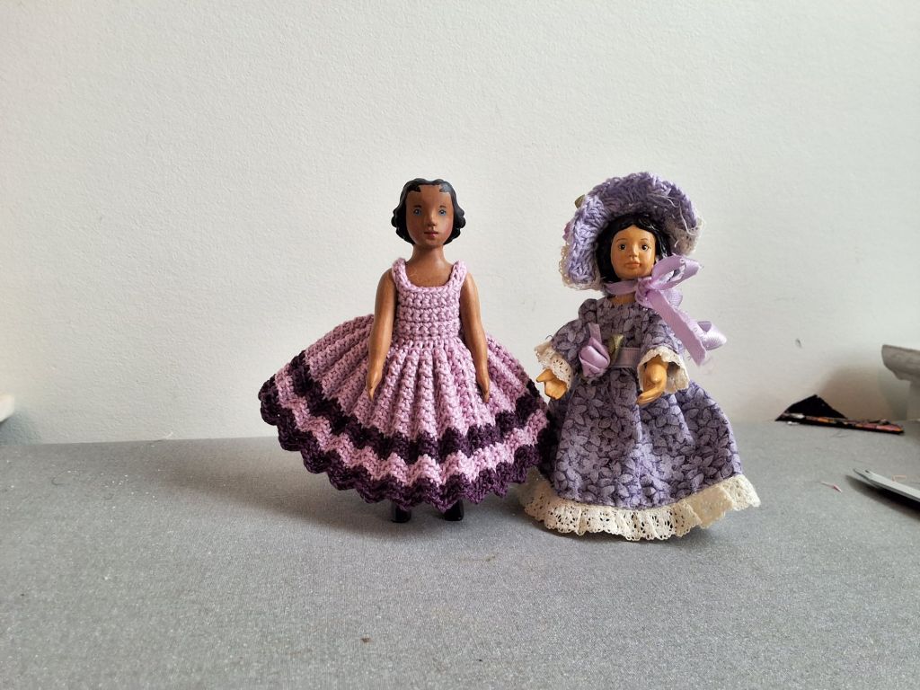 Hitty alla wearing a purchased crocheted dress and itty bitty hitty wearing a dress handsewn by miss mary