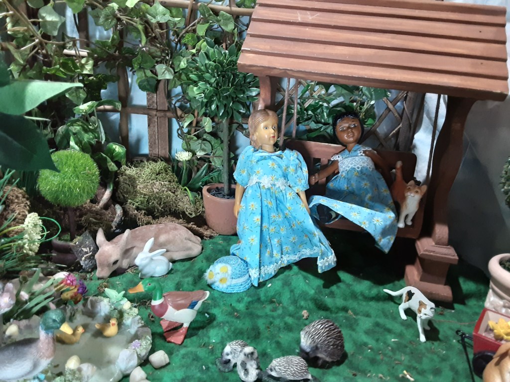 And last but not the least my two best friends Hitty Belle and Hitty Lou relaxing in the yard wearing summer dresses sewn by miss nary