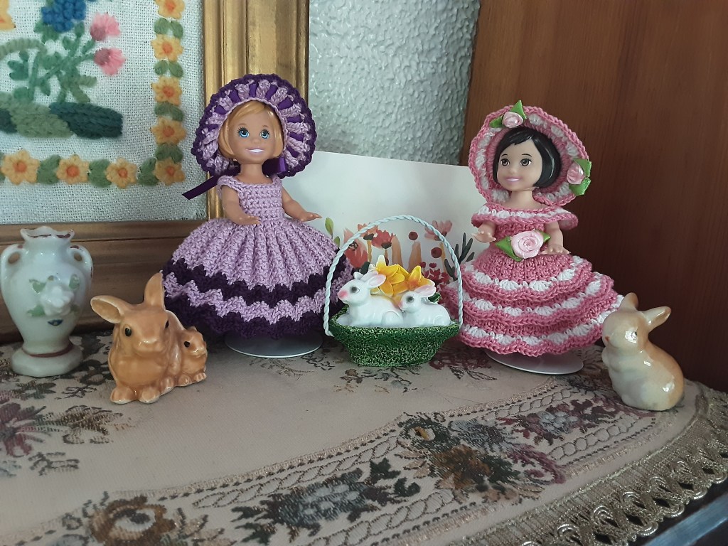Two more of my molded hair kelly doll friends. They are wearing crocheted dresses which were purchased on ebay. Unfortunately miss mary is a bit confused on who the creators were and can not give credit where credit is due for the incredible creations. Are they not just gorgeous? Way out of miss Mary’s creative abilities.