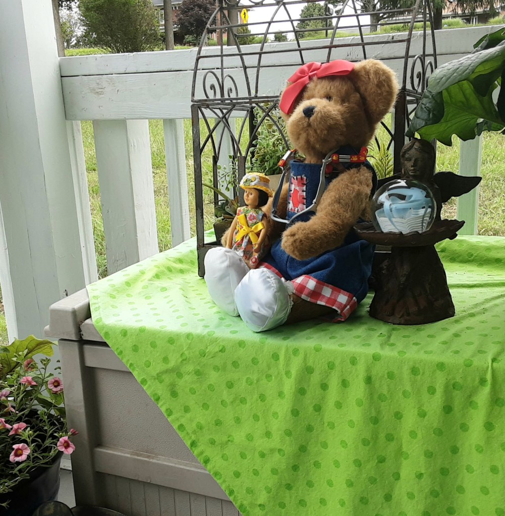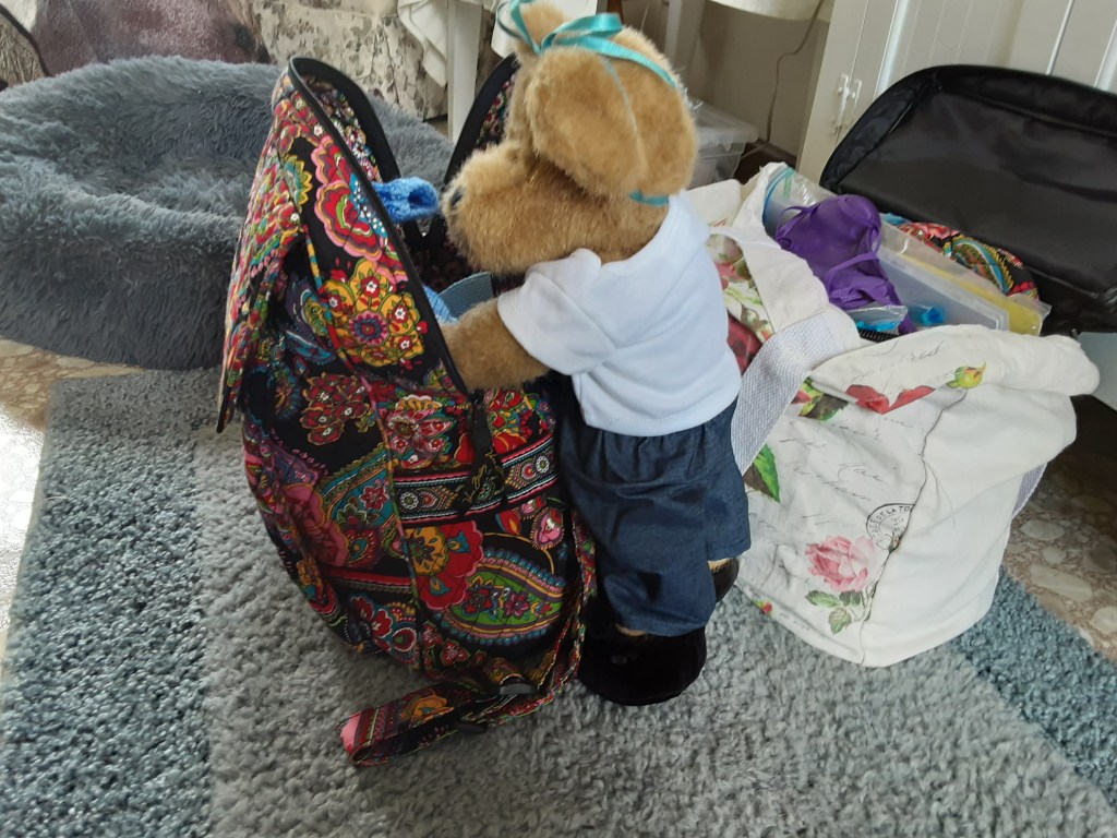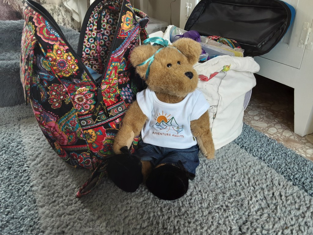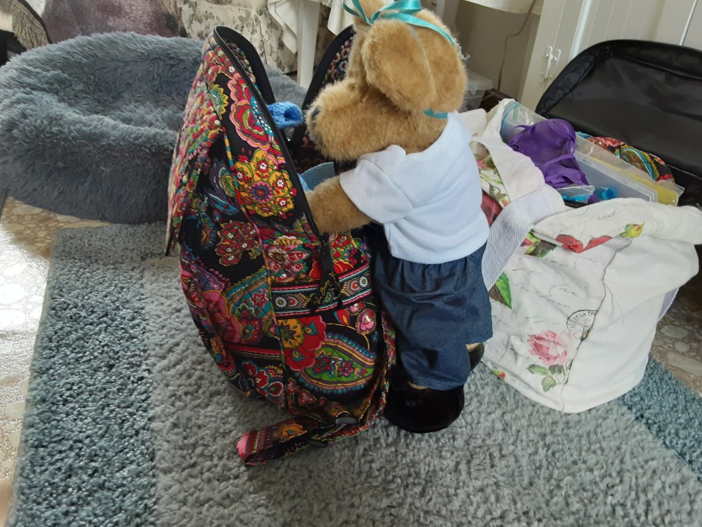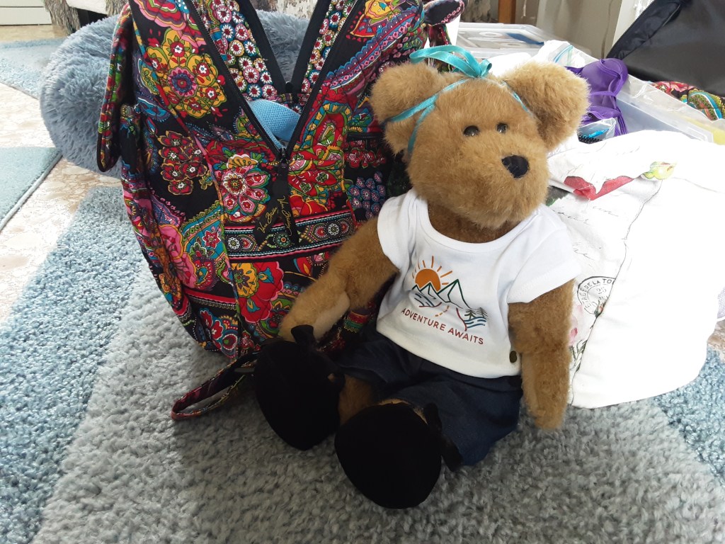 Sandy bear prepares for her very first long road trip.