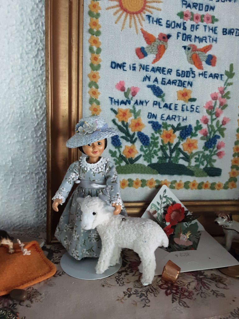 The lovely picture was handstitched by Miss Mary’s dear mother Grandma Ruth who also had adopted a Raikes Hitty and was a dear friend of mine. I used to fly to Bridgeville Pa from Rock Hill, SC often to visit with them. Such sweet memories of good times.